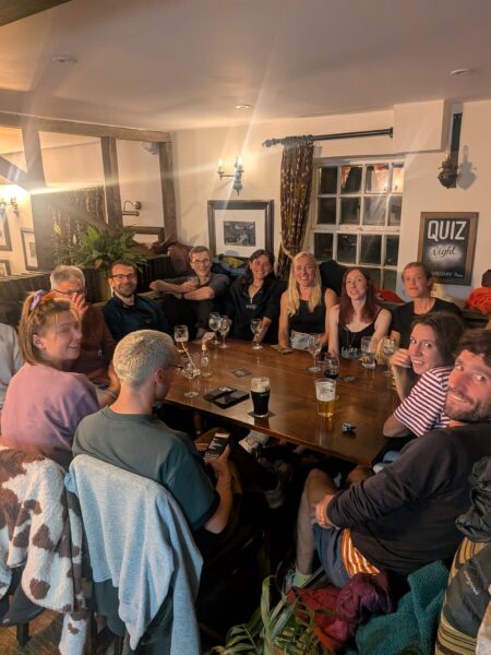 Session 3 19:00: The Rising Sun. After mountains of spaghetti bolognese, a short walk up the trail found us in the nearest pub. On pump were Bass and Blue Monkey plus a 6% brew which we kept well away from. At this stage Sina made an announcement telling us about the ceremony he attended last week and how is is now a British Citizen. It was suggested that, now that he is British, he needs to improve his beer intake. Indeed, we were surprised that the subject isn’t on the Life In The UK test. After that the karaoke started. “What fresh hell is this?” as Dorothy Parker put it as the steady flow of bottles of white wine across the bar for three of the ladies continued. With blackmail demands remaining unpaid, this is a link IMG_7160 to Sarah-Jane and Annie tearing up at the karaoke. What is surprising is that Annie can manage this after two hard sessions plus running 17:48 for 5k the night before. It sounds even worse when sober.