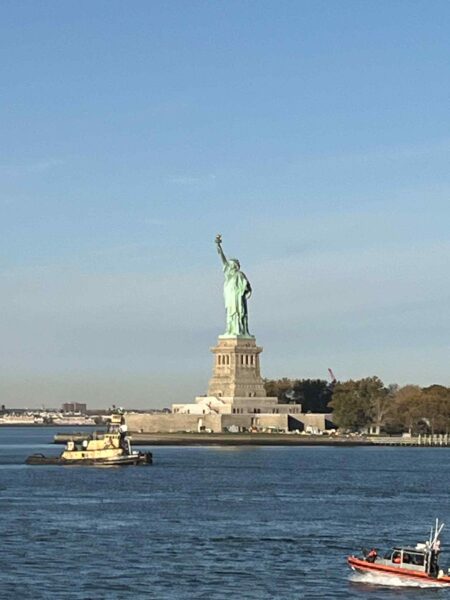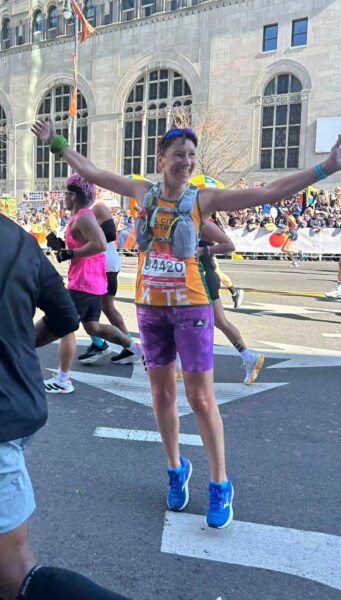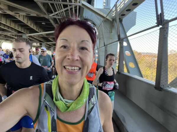 Pink wave at the start on the bottom tier of the Verrazzano Narrows Bridge with more starting on the upper tier. It was so congested that there was time for a selfie. Whilst the elites were off at 8:30am and 09:00am Kate’s start was much later and it was already feeling warm.